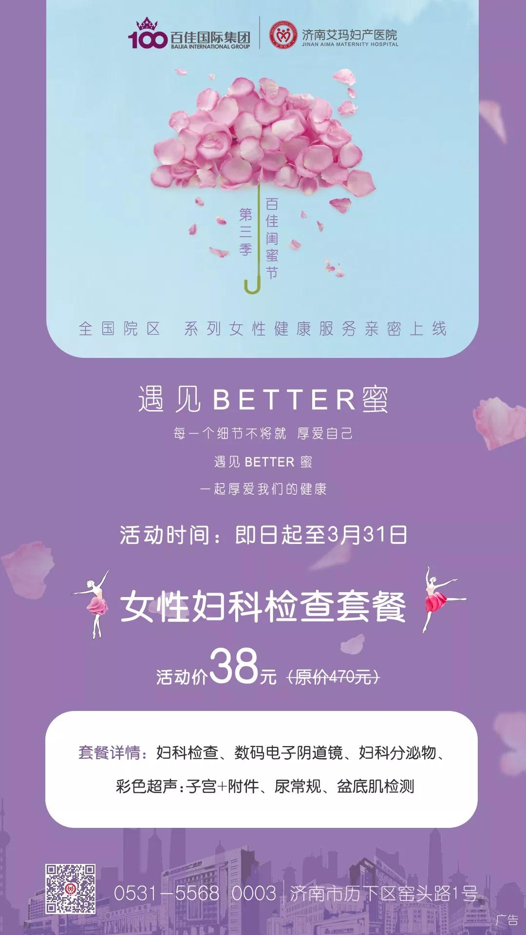 烟花三月,我们为你准备了专属于你的妇科检查优惠套餐,套餐饱含了妇科检查、电子阴道镜、子宫+附件、尿常规和盆底肌检测。艾玛闺蜜节现价只需38元。这个春天,只要笑颜,不要愁“炎”,让你从头到尾,直美美哒~