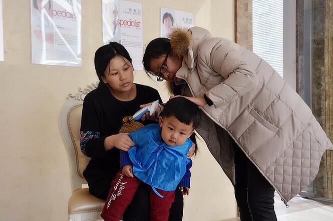 给宝宝理发可是门技术活哦,艾玛特邀专业理发师为宝宝理发,放心哦!