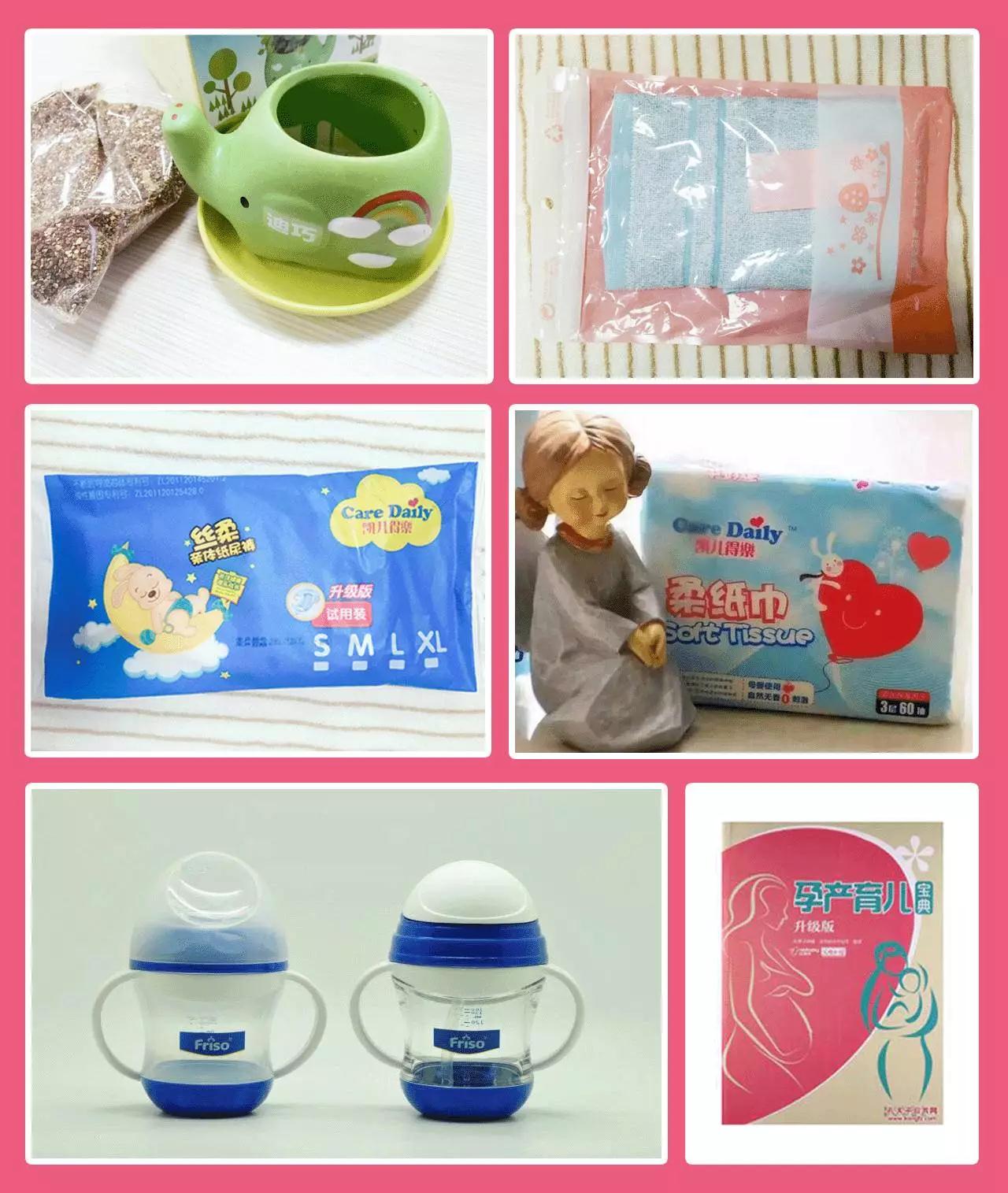 迪巧负离子盆栽、全棉吸水宝宝洗脸巾、凯儿得乐尿不湿包+面巾纸袋、美素佳儿学饮杯、《孕产育儿》宝典