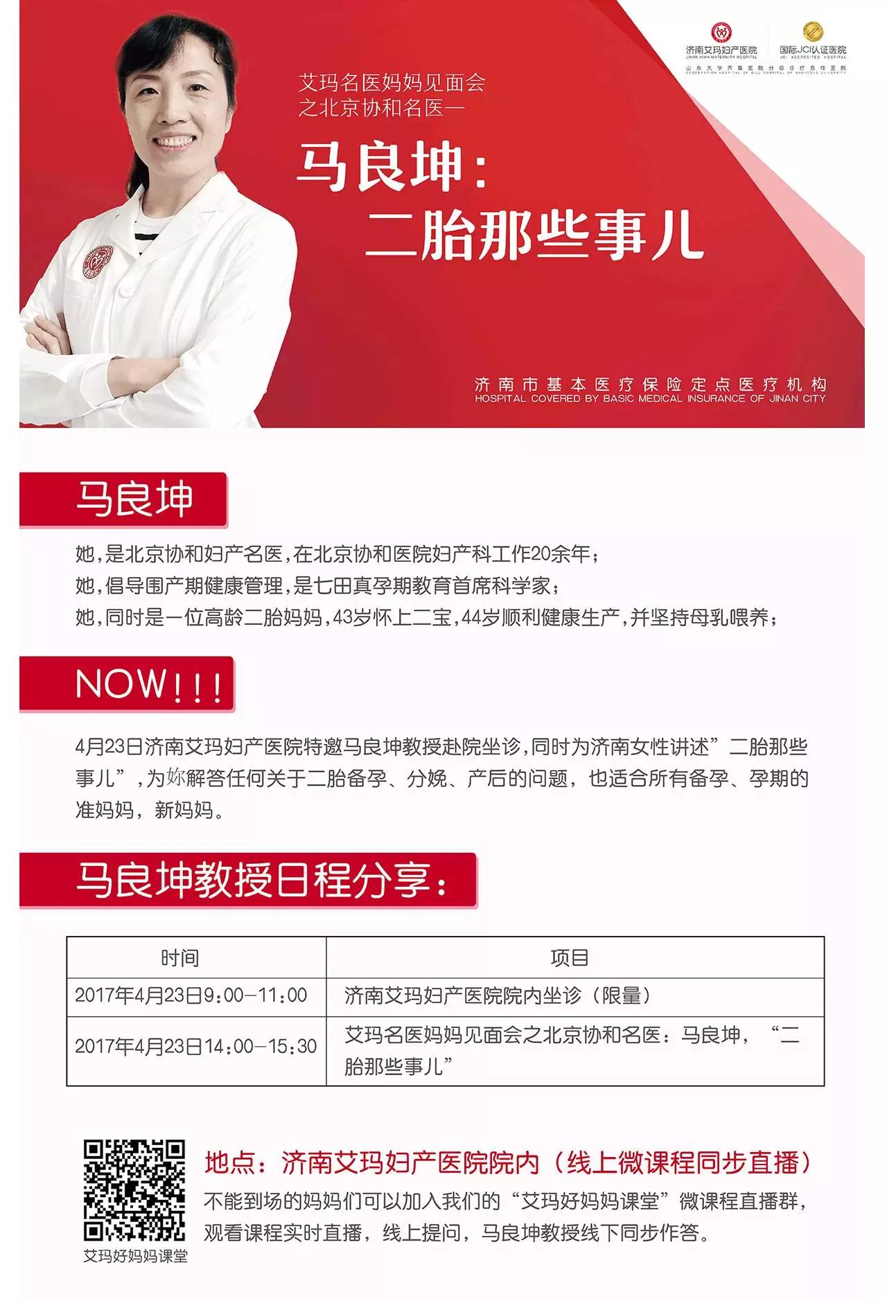 很多孕妈会好奇,作为高龄产妇同时又是妇产行业工作者,马教授是如何备孕、怀孕、分娩的呢?为此,4月23日,济南艾玛妇产医院特邀马良坤教授来院,举办场“马良坤:二胎那些事儿”明星二胎妈妈见面会,为你解答这切。