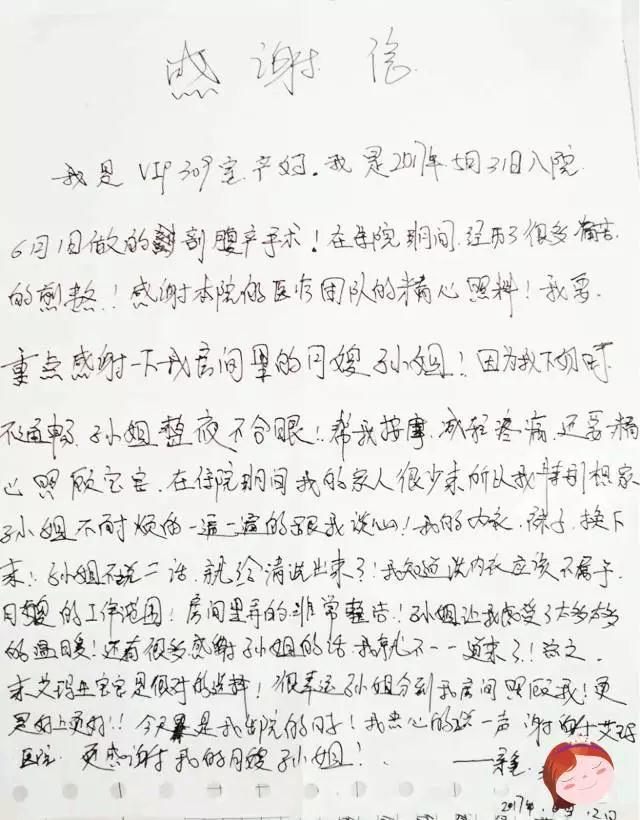 来自艾玛妇产三楼309房间的宝妈张女士,月初剖宫产分娩健康宝宝。月嫂孙焕荣悉心照顾她,专业又熟练,对宝宝耐心照护,合理的管理张女士和宝宝的饮食起居,更是认真的教导张女士正确哺育和照护宝宝,令张女士很是感激,在做完月子的时候,手写这封感谢信,表示对月嫂孙焕荣、对艾玛的感激之情。
