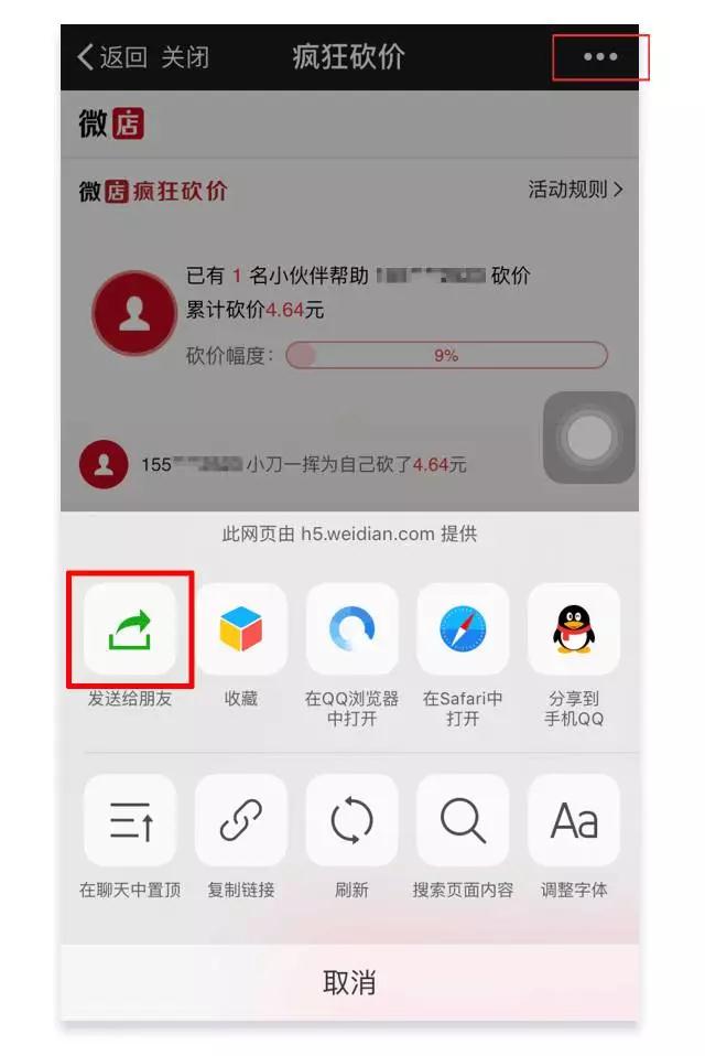 (点右上角选择“发送给朋友”让朋友来帮忙“砍价”,当然,发到群里也可以的~)