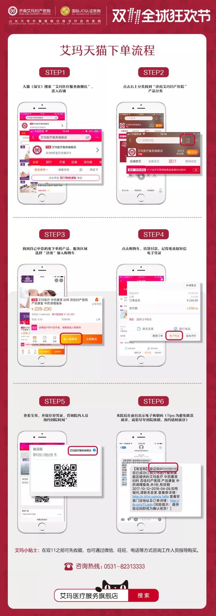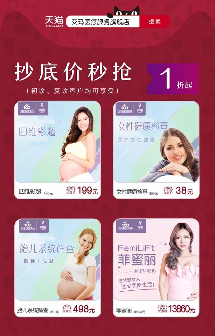 1 淘宝、天猫APP扫描下方二维码或搜索“艾玛医疗服务旗舰店”进入店铺,点击“济南院区”即可进入“济南艾玛妇产医院”查找所需的项目,提前添加至购物车。