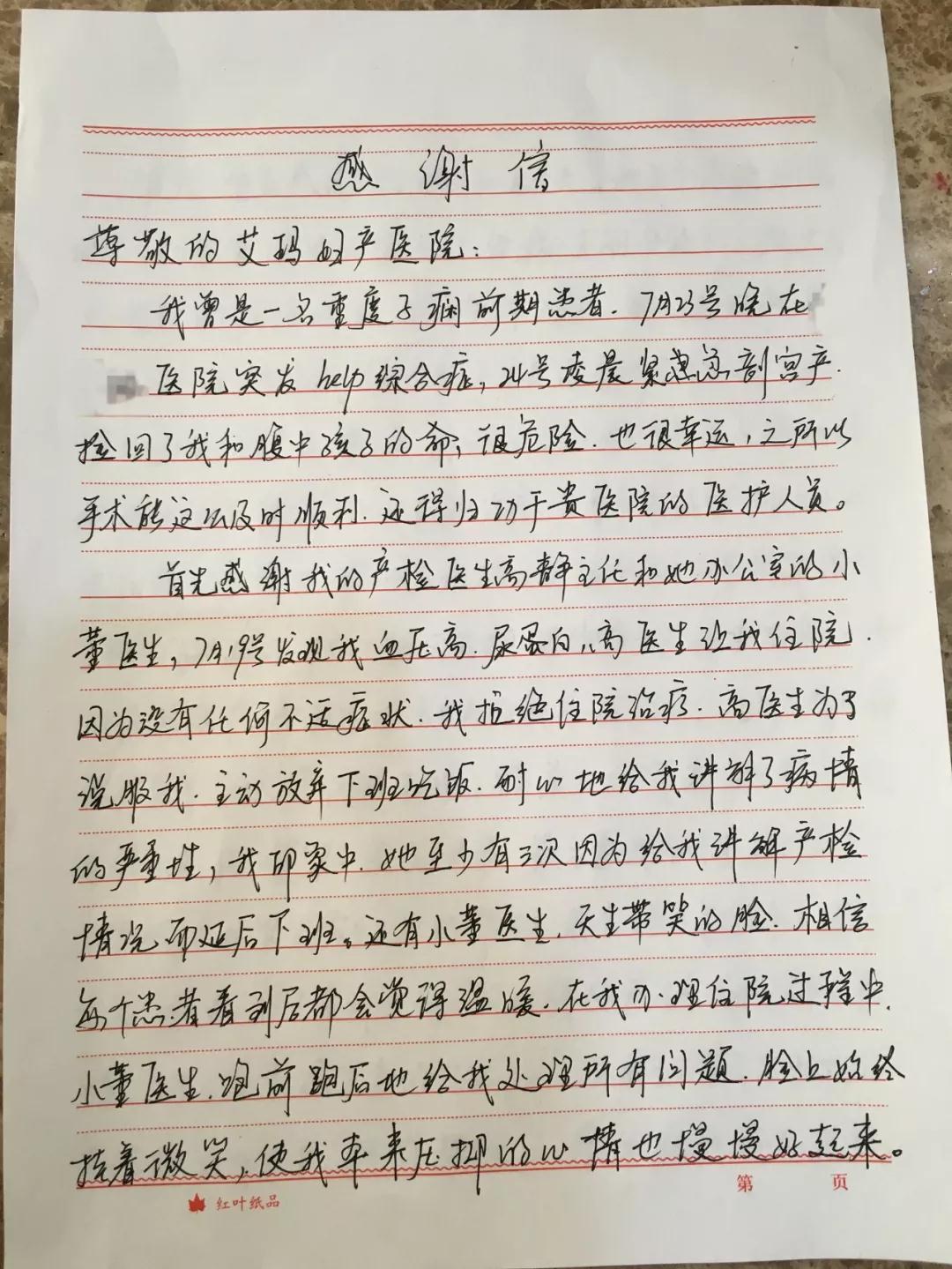 昨天,我们收到了封宝妈的来信。这是位重度子痫前期的患者,在平安生产后为济南艾玛妇产医院的医护人员所写的封感谢信,感谢大家对她的积极帮助,让她能够渡过生产难关。