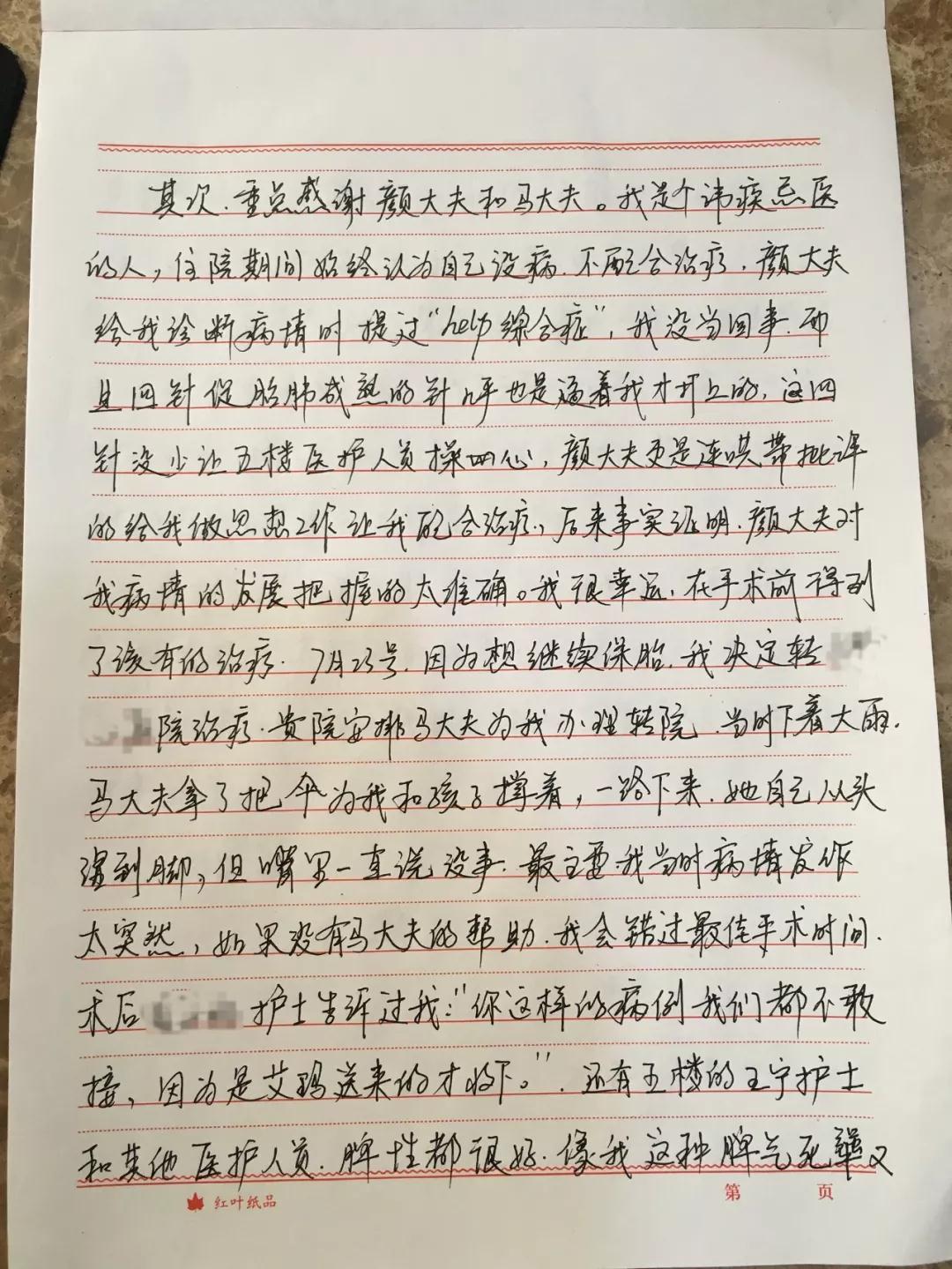 其次,重点感谢颜大夫和马大夫。我是个讳疾忌医的人,住院期间始终认为自己没病,不配合治疗。颜大夫给我诊断病情时提过“HELLP综合症”,我没当回事,而且四针促胎肺成熟的针几乎也是逼着我才打上的,这四针没少让五楼医护人员操心,颜大夫更是连哄带批评的给我做思想工作让我配合治疗,后来事实证明,颜大夫对我病情的发展把握的太准确。我很幸运,在手术前得到了该有的治疗。