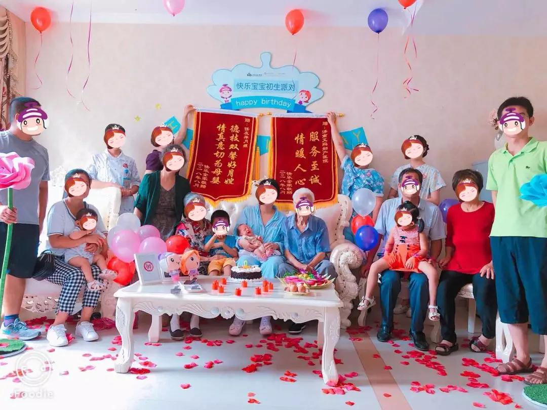 这可真够浪漫的啊,我们还注意到张合照,照片上面孙女士拿着两位老人写给小宝宝的祝福语,后面墙上贴着快乐宝宝的初生派对,桌上放着我们的准备的水果。