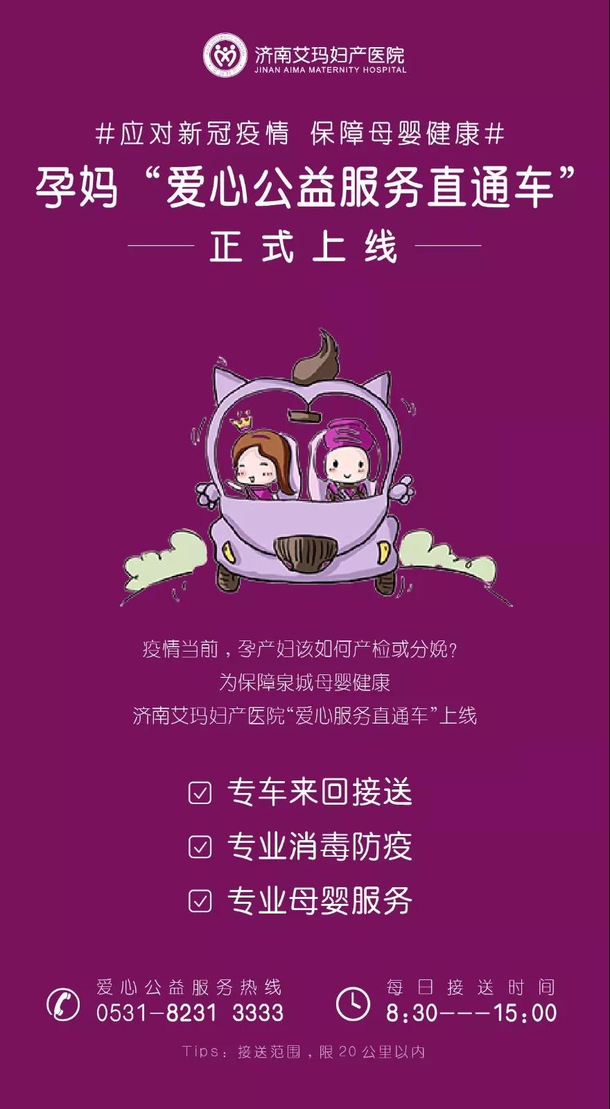 “新冠”疫情当前,宝妈们都在担心个问题,那就是交叉感染。为了肚中宝宝,宝妈不想冒任何风险,这些担忧,我们岂能不理解?为了使泉城宝妈能有个安心的孕产期,方便宝妈产检和分娩,济南艾玛妇产医院“爱心公益服务直通车”正式上线,免费接送宝妈到艾玛产检和分娩!