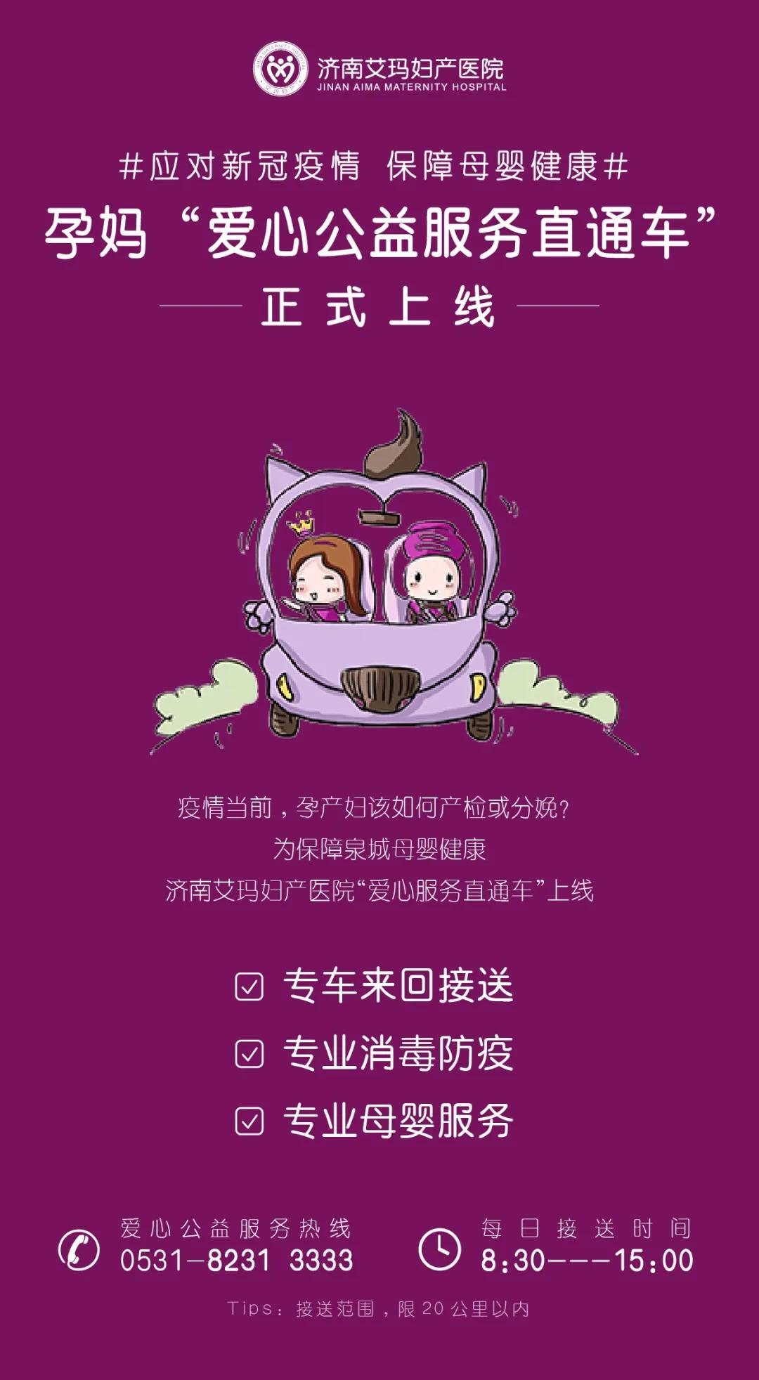 不用着急,艾玛妇产有“爱心公益直通车”计划,宝妈只要拨打0531-82313337,艾玛就会派专车去接你。