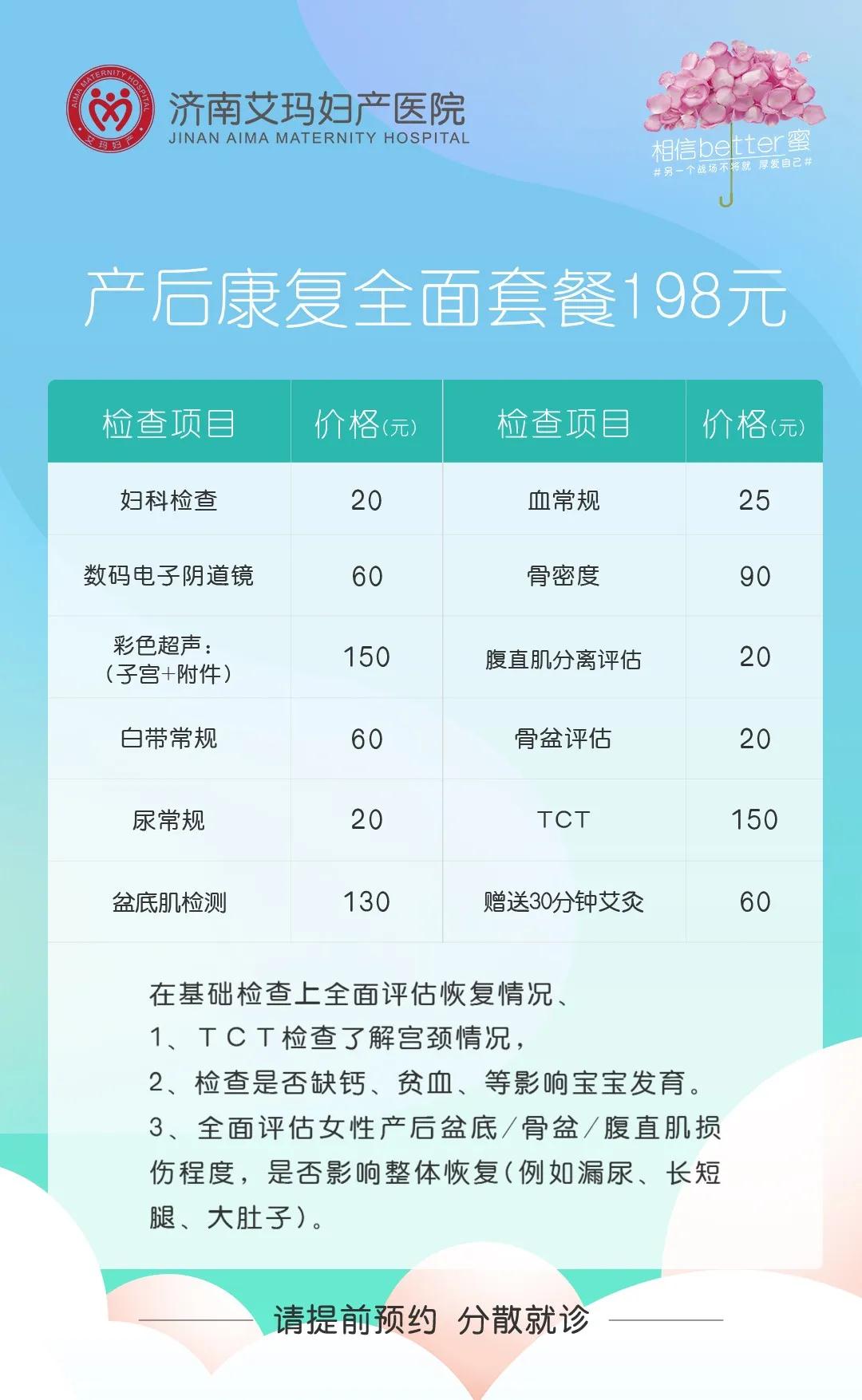 济南艾玛四月份推出产后康复全面套餐,产后的宝妈定要做个检查,发现问题早治疗,早恢复。