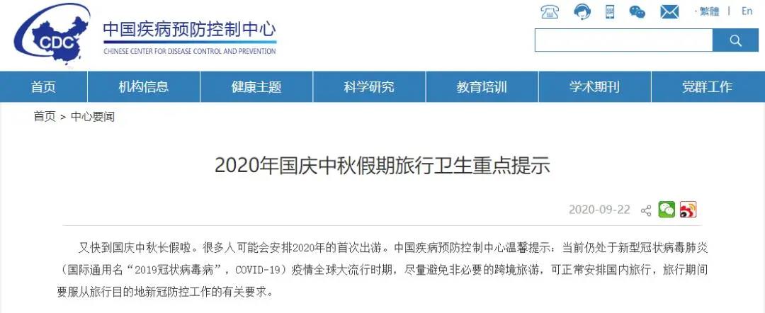 近日,中国疾病预防控制中心在官网发布《2020年国庆中秋假期旅行卫生重点提示》,指出当前仍处于新型冠状病毒肺炎(通用名“2019冠状病毒病”,COVID-19)疫情全球大流行时期,尽量避免非必要的跨境旅游,可正常安排国内旅行,旅行期间要服从旅行目的地新冠防控工作的有关要求。