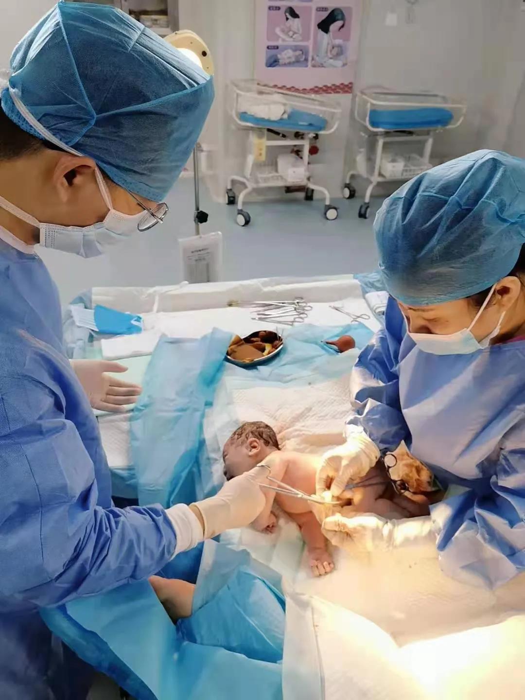 艾玛资深助产士孟莲把宝宝抱到宝爸跟前