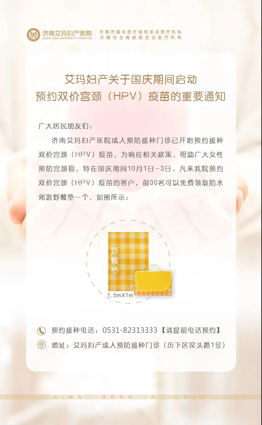 济南艾玛妇产医院成人预防接种门诊已开始预约接种双价宫颈(HPV)疫苗,为响应相关政策,帮助广大女性预防宫颈癌,特在国庆期间10月1日-3日,凡来我院预约双价宫颈(HPV)疫苗的客户,前30名可以免费领取防水郊游野餐垫个,野餐垫数量有限,先到先得。