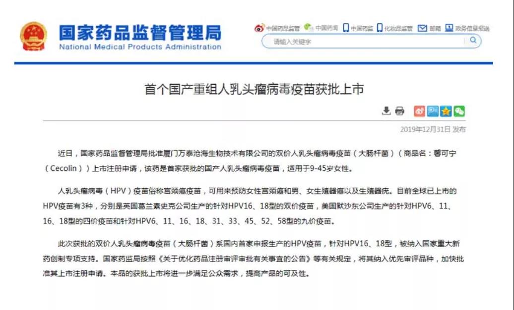 2019年12月,国家药品监督管理局批准厦门万泰生物的双价人乳头瘤病毒疫苗上市。这是获批的国产HPV疫苗,目前我院的二价HPV疫苗均为厦门万泰生物所生产。